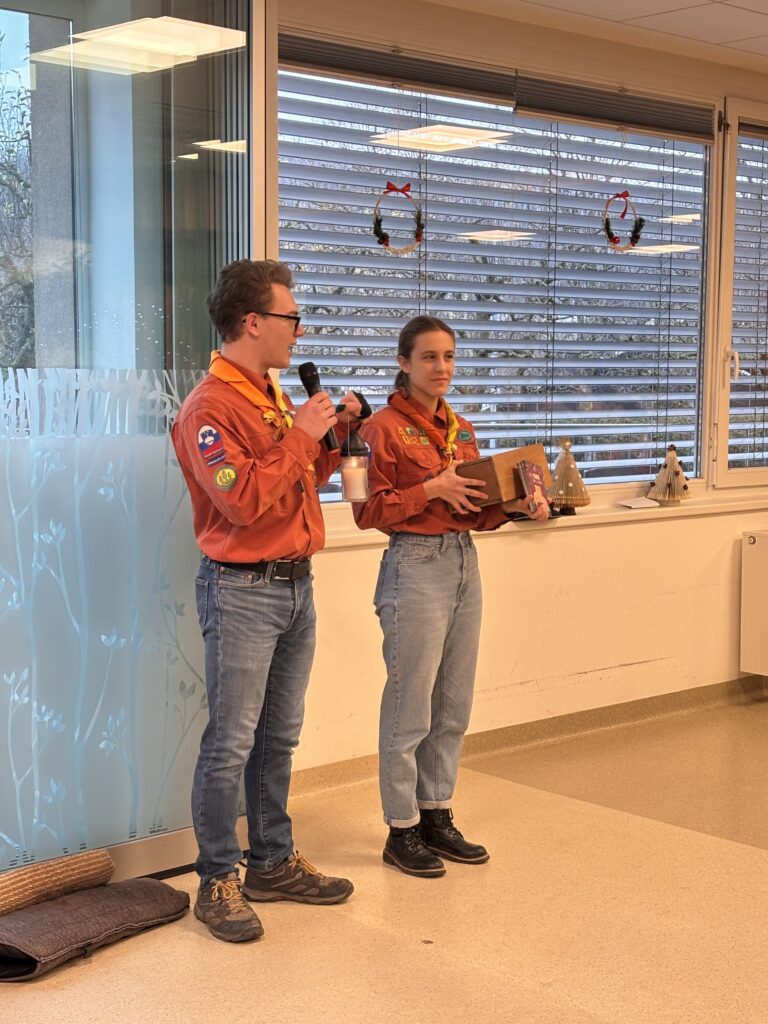 V ponedeljek, 22.12.2025, sta nas s svojim obiskom razveselila grosupeljska skavta in nam prebrala poslanico ter prinesla Betlehemsko luč miru.